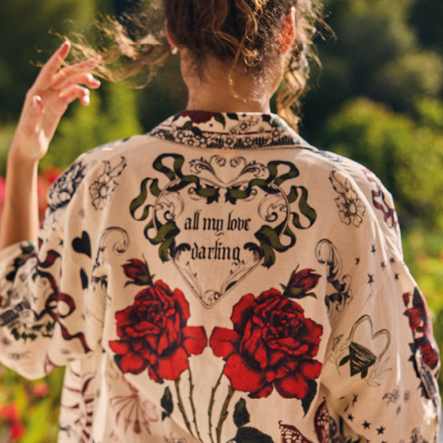 Roses, snakes, and intertwined hearts tell a story of passion and defiance. Bold and mysterious tones that tattoo the desire to break the rules onto your skin.